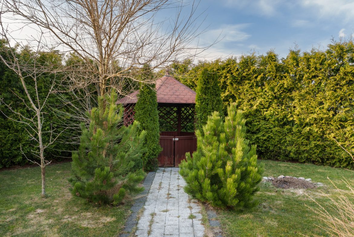 -zadbana zieleń w ogrodzie, w którym dodatkowo znajdziemy altanę, fontannę, nasadzenia i system nawodnienia.
