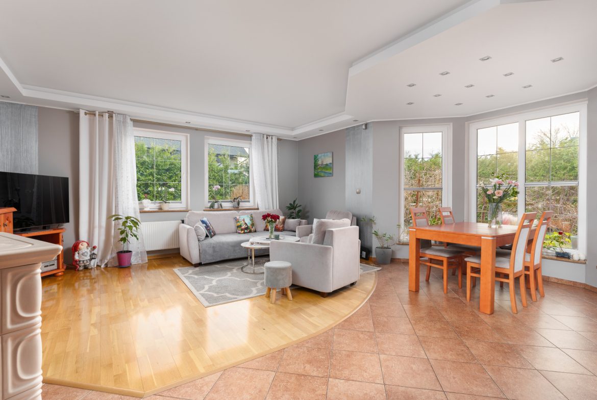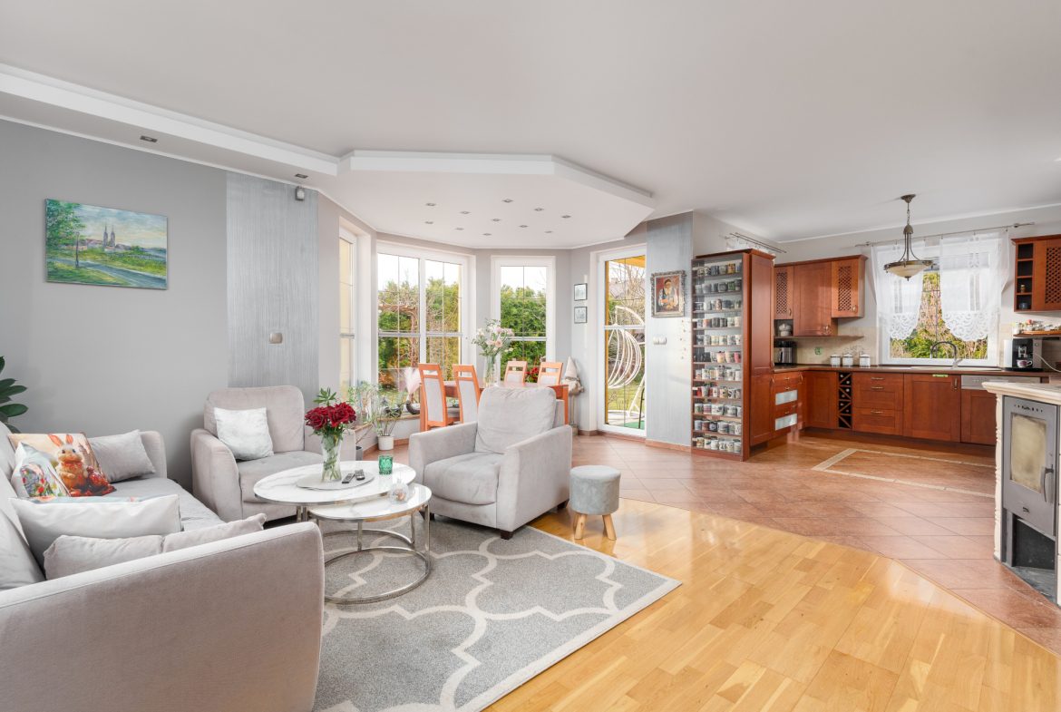 -duża część dzienna z otwartą kuchnią i jadalnią w wykuszu