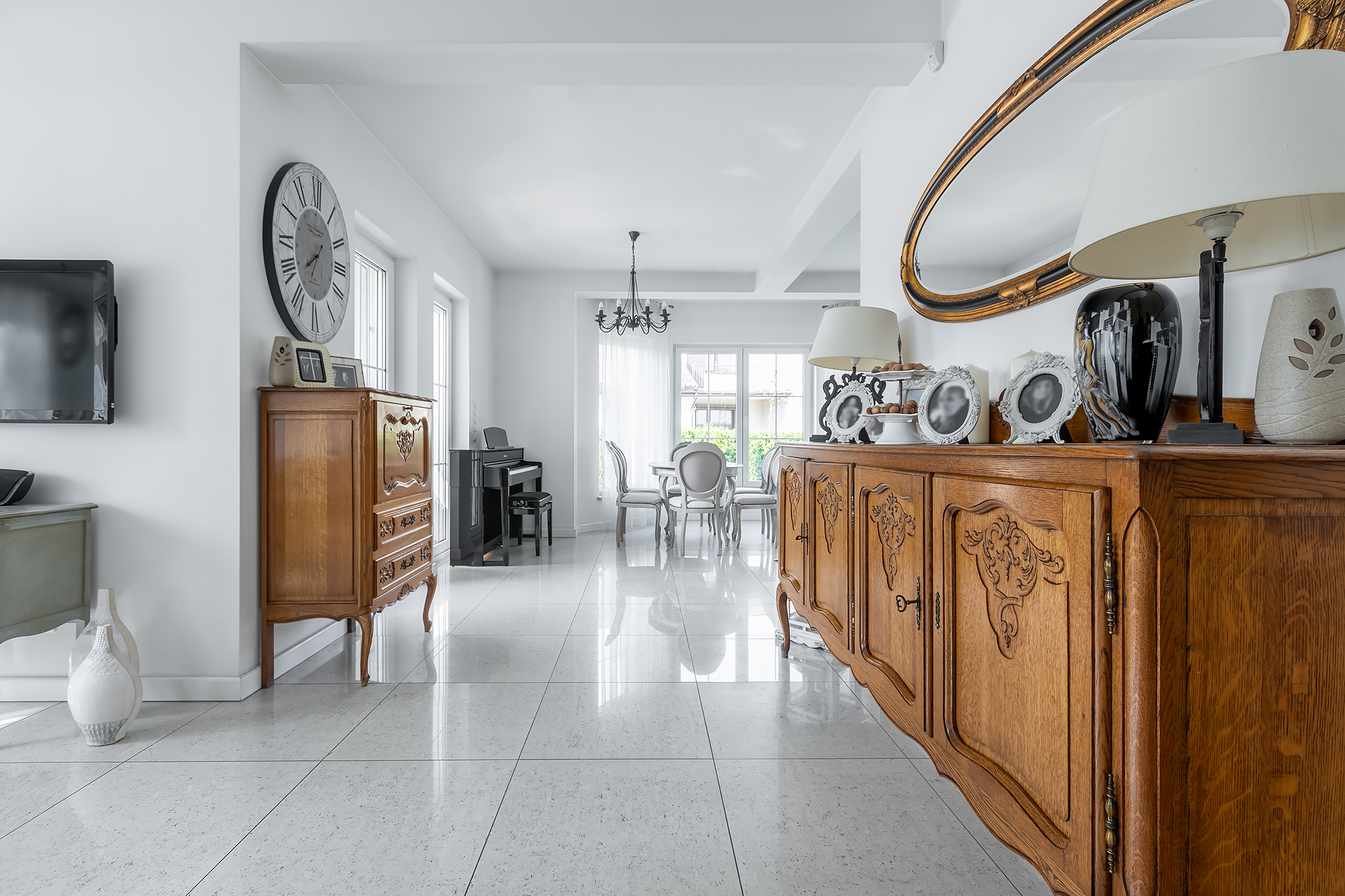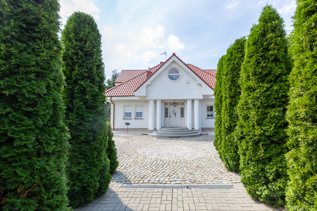 Już samo położenie działki jest wyjątkowe – znajduje się ona w drugiej linii zabudowy, co zapewnia odpowiednią dozę prywatności. Do posesji prowadzi długa aleja, a po obu jej stronach rosną wysokie tuje, tworzące nieprzeniknione, zielone ściany. Nadaje to nieruchomości odpowiedniego charakteru i wzniosłości.