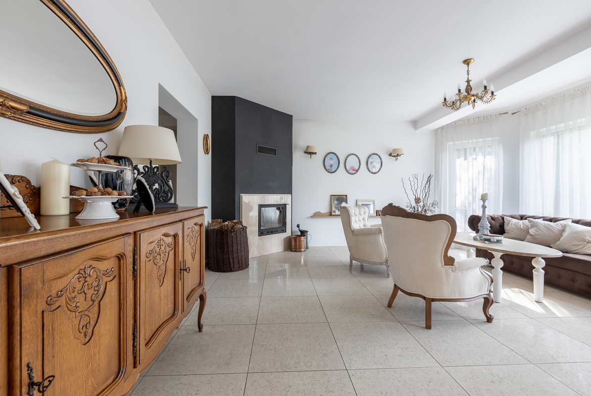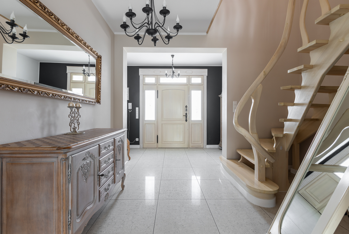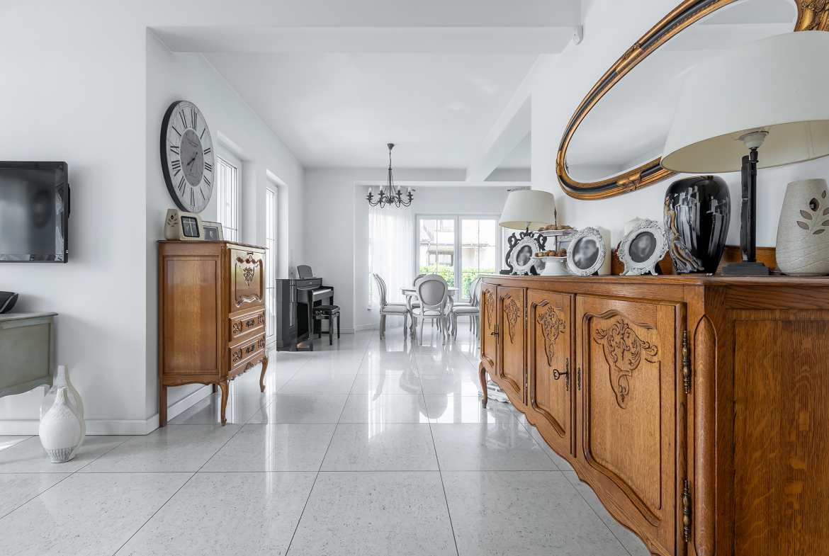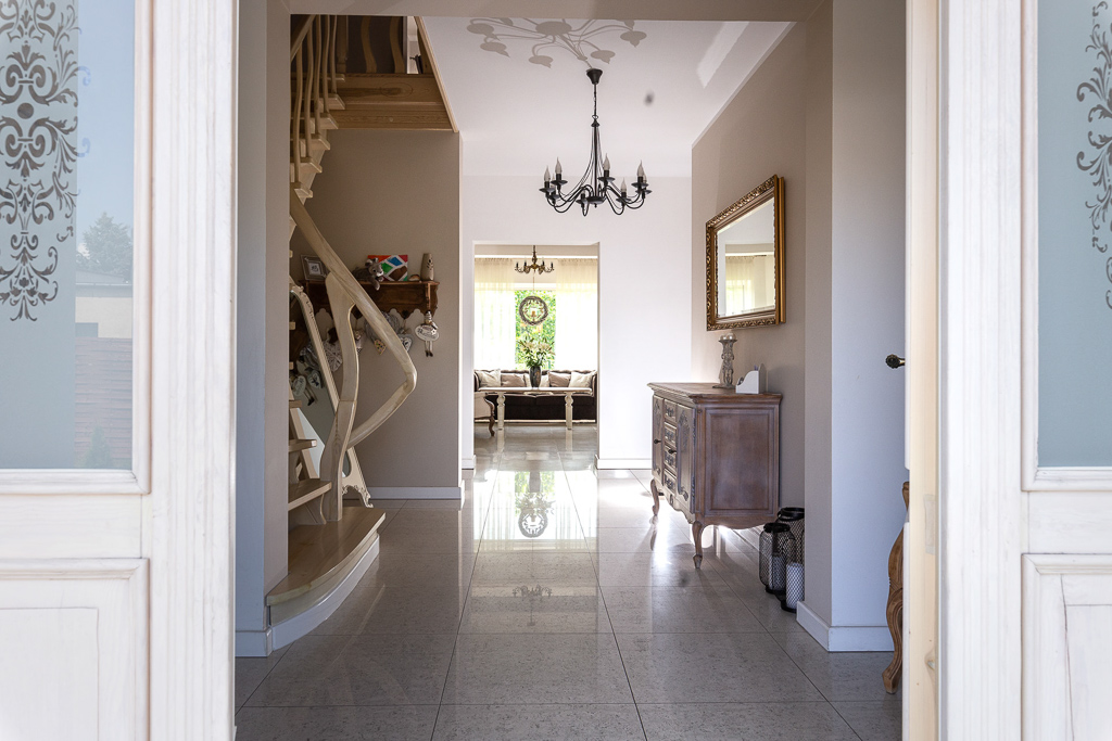 Wnętrze zostało zaprojektowane gustownie i z dbałością o szczegóły. Drewniane schody i drzwi, zabudowa kuchenna, brama wjazdowa – wszystkie te elementy zostały wykonane na indywidualne zamówienie. Styl tego domu łączy ze sobą klasę i ciepło domowego ogniska. To wyjątkowe połączenie, które zdecydowanie zadowoli osoby dążące do życia na najwyższym poziomie.