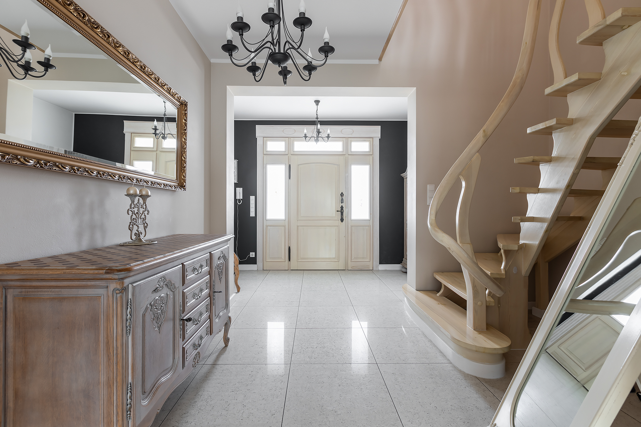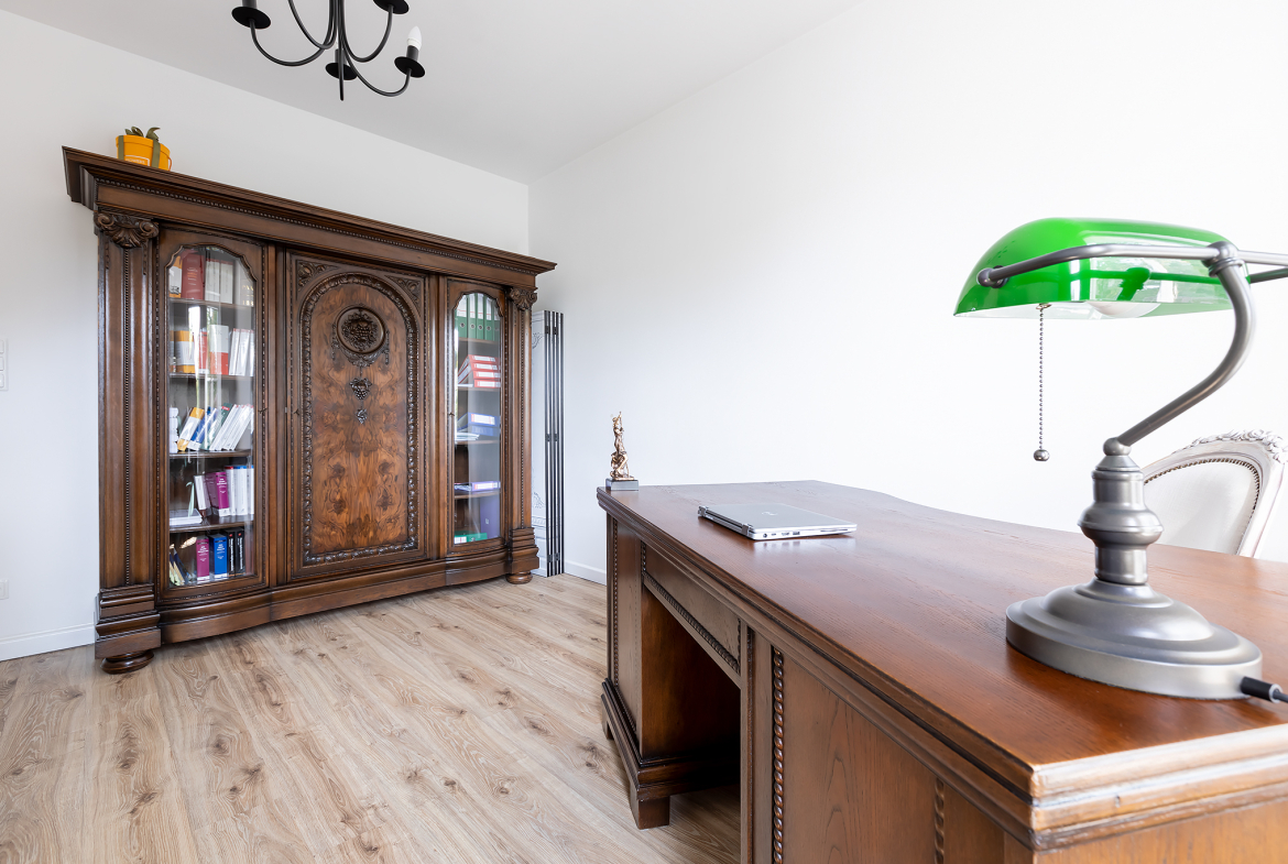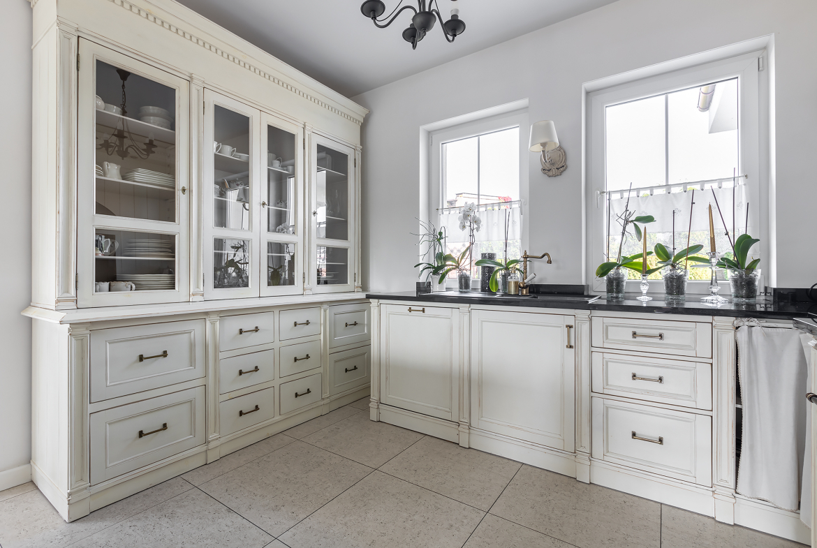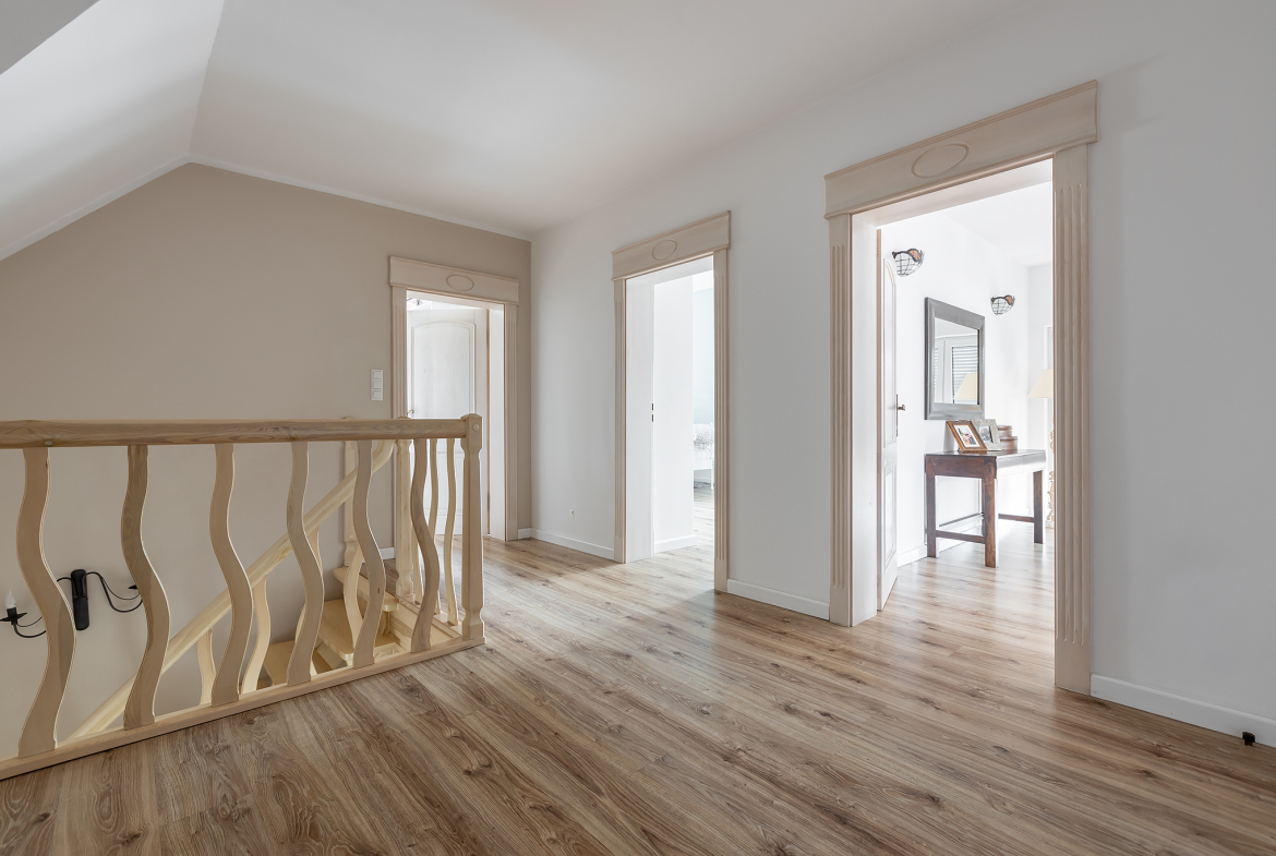 Wnętrze zostało zaprojektowane gustownie i z dbałością o szczegóły. Drewniane schody i drzwi, zabudowa kuchenna, brama wjazdowa – wszystkie te elementy zostały wykonane na indywidualne zamówienie. Styl tego domu łączy ze sobą klasę i ciepło domowego ogniska. To wyjątkowe połączenie, które zdecydowanie zadowoli osoby dążące do życia na najwyższym poziomie.