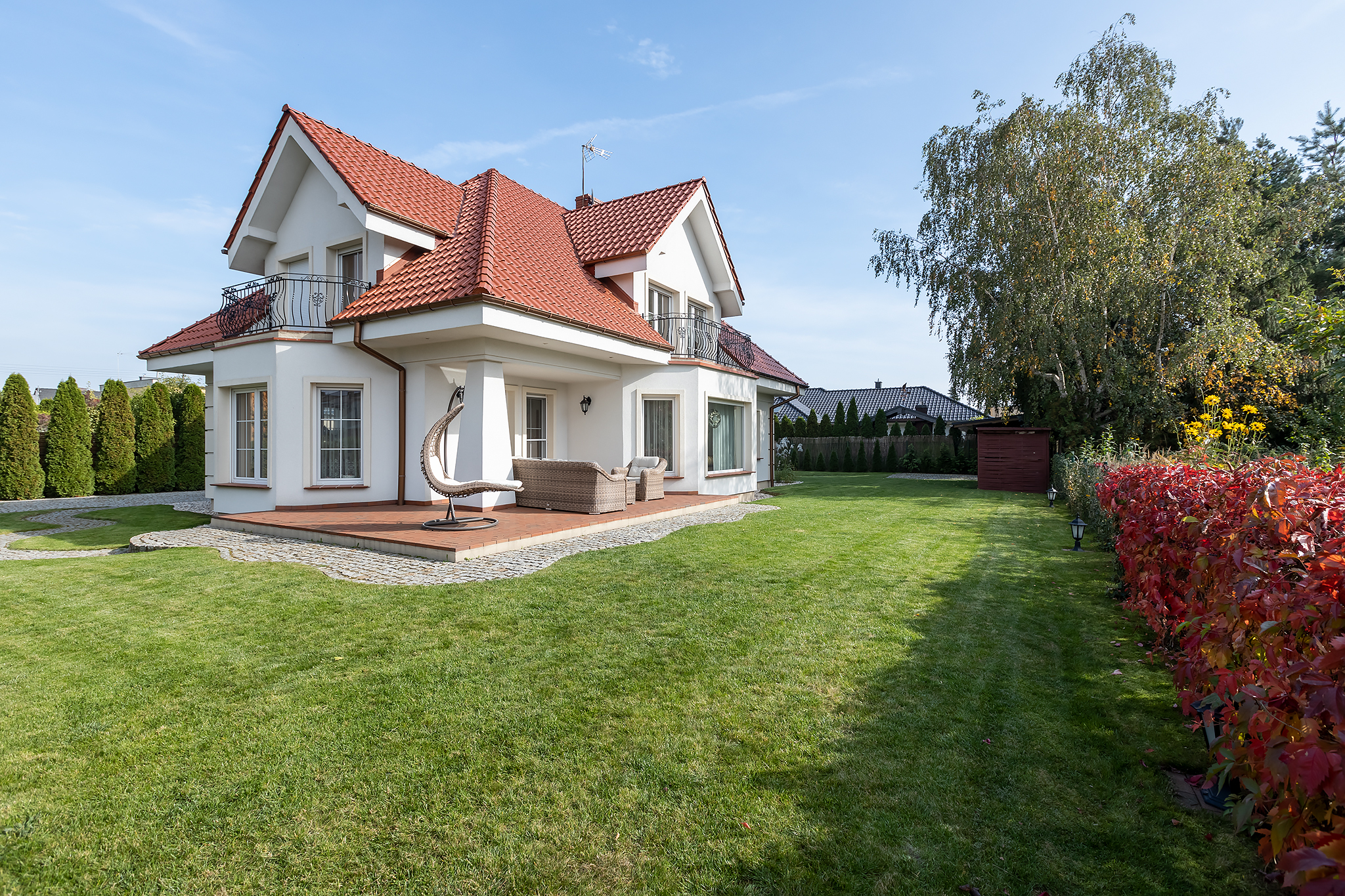 Dom zaprojektowano z najwyższą starannością. Zadbano o jakość materiałów, estetykę wykończenia, a także otoczenie – kolorowy ogród.