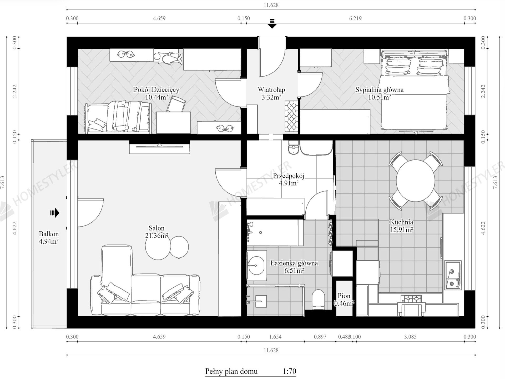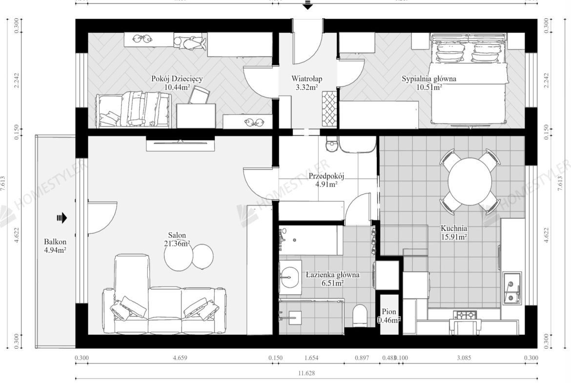 - przestronnego salonu (21,36 m²) z wyjściem na balkon (4,94 m²),