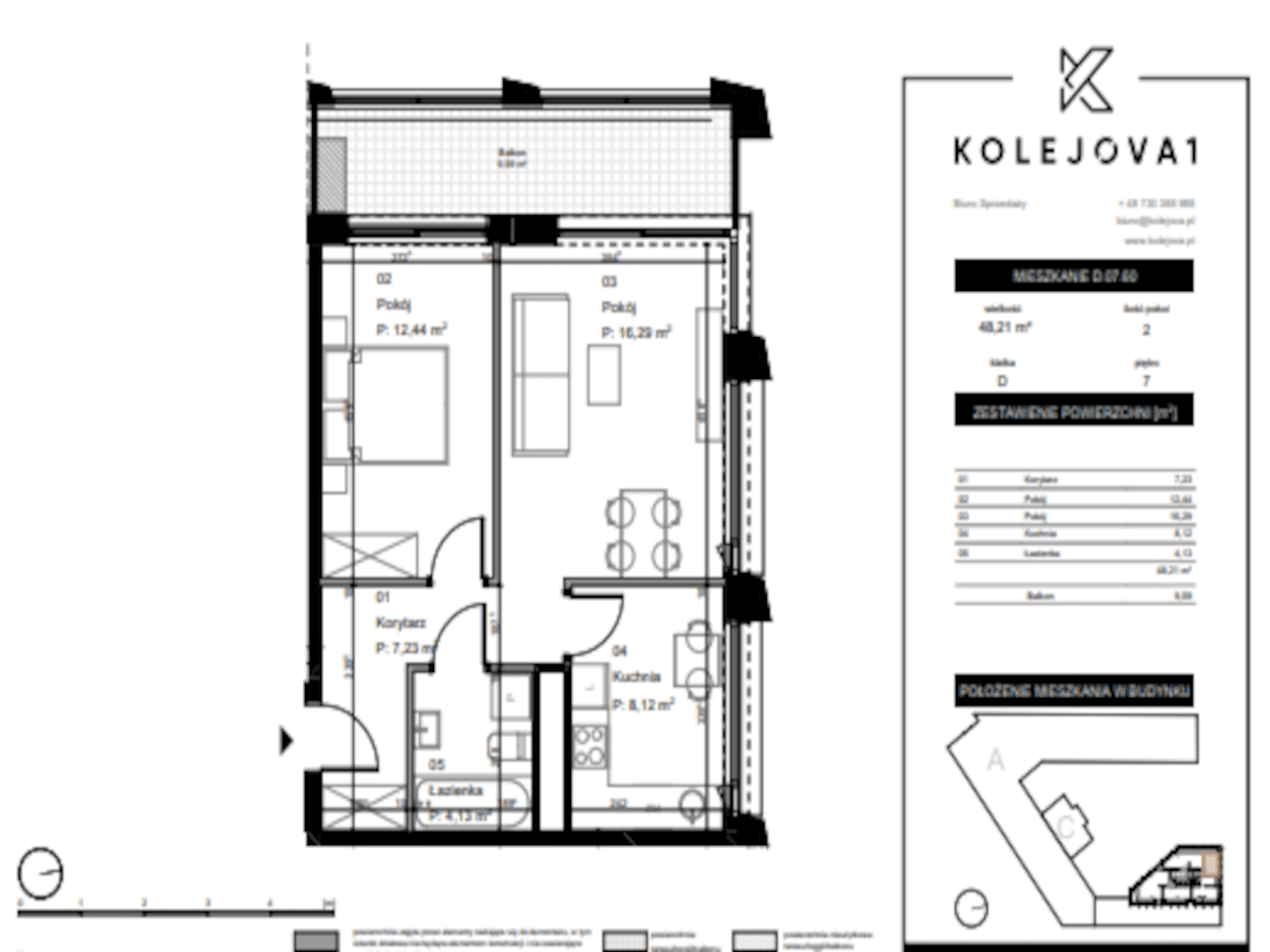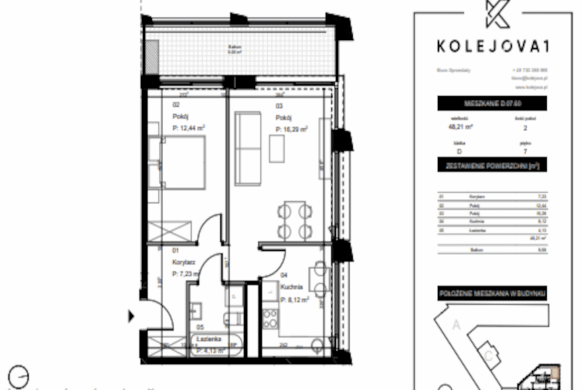 Na sprzedaż komfortowe, dwupokojowe mieszkanie 48,21 m² z dużą loggią (9,59 m²), położone na 7. piętrze nowoczesnego budynku „Wieża” w inwestycji Kolejova 1 na Łazarzu. Dwustronna ekspozycja – północ i zachód.