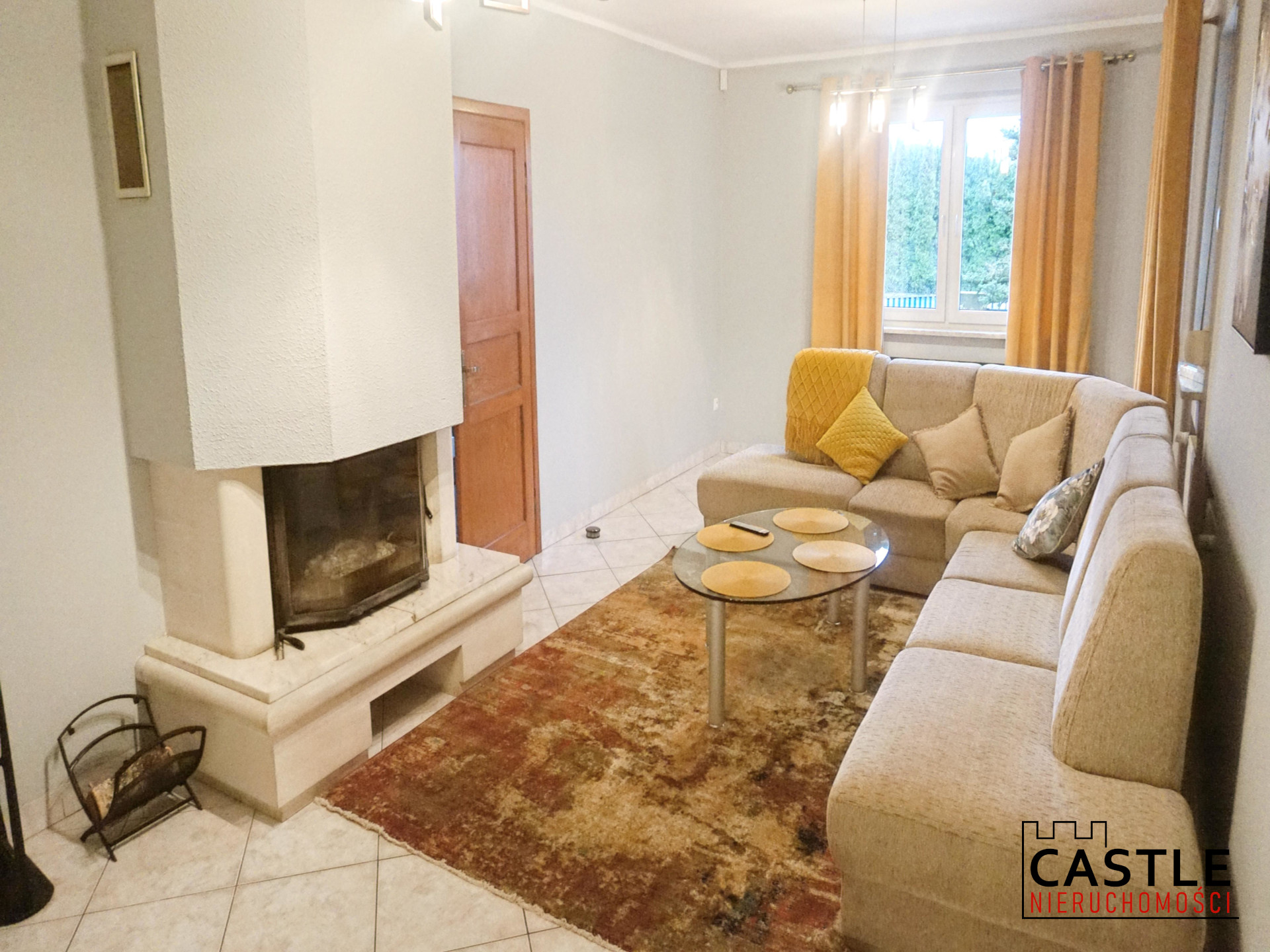 - salon z kominkiem oraz wyjściem na taras