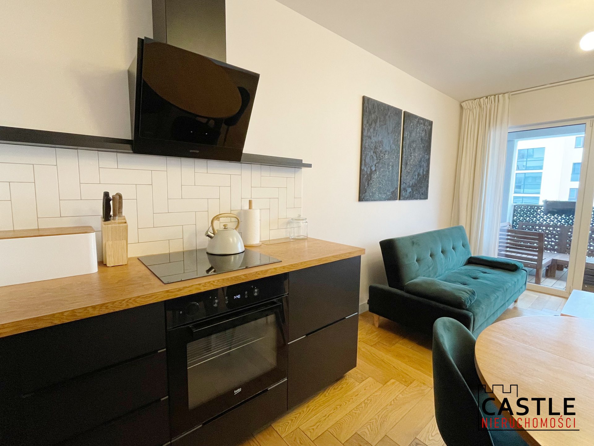 - salon z aneksem kuchennym i wyjściem na balkon