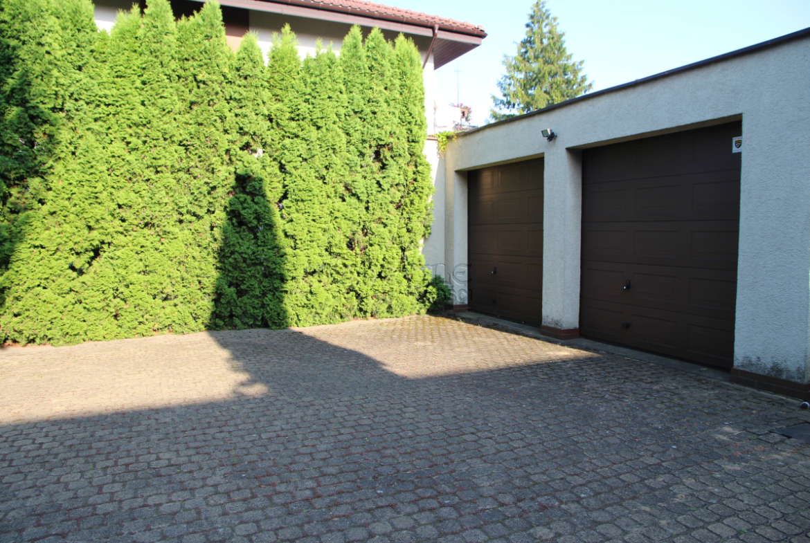 Ogród pięknie zagospodarowany. Z tyłu na posesji garaż dwustanowiskowy oraz parking na minimum 4 samochody. Budynek jest monitorowany. Ogrodzony. Wysoka roślinność izoluje i sprawia iż można poczuć się swobodnie na własnej posesji. Niezależny układ wszystkich pomieszczeń.