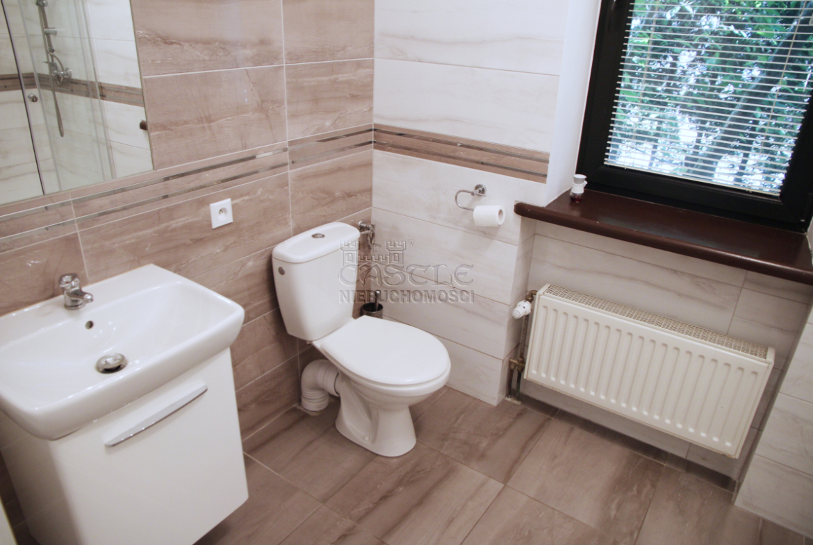 Standard wykończenia – na podłogach nowsze (ok. 5 lat), piękne, kafle gresowe. Łazienki na dole wyremontowane ok. 5 lat temu. Ściany szpachlowane i malowane na biało. Okna PCV oraz drewniane w części przyziemia. Dodatkowe wejście do pomieszczenia z boku budynku przeszklone, z profili aluminiowych. Świetnie doświetlone wnętrza, nowoczesne oświetlenie wszystkich pomieszczeń. Kuchnia umeblowana, wyposażona.