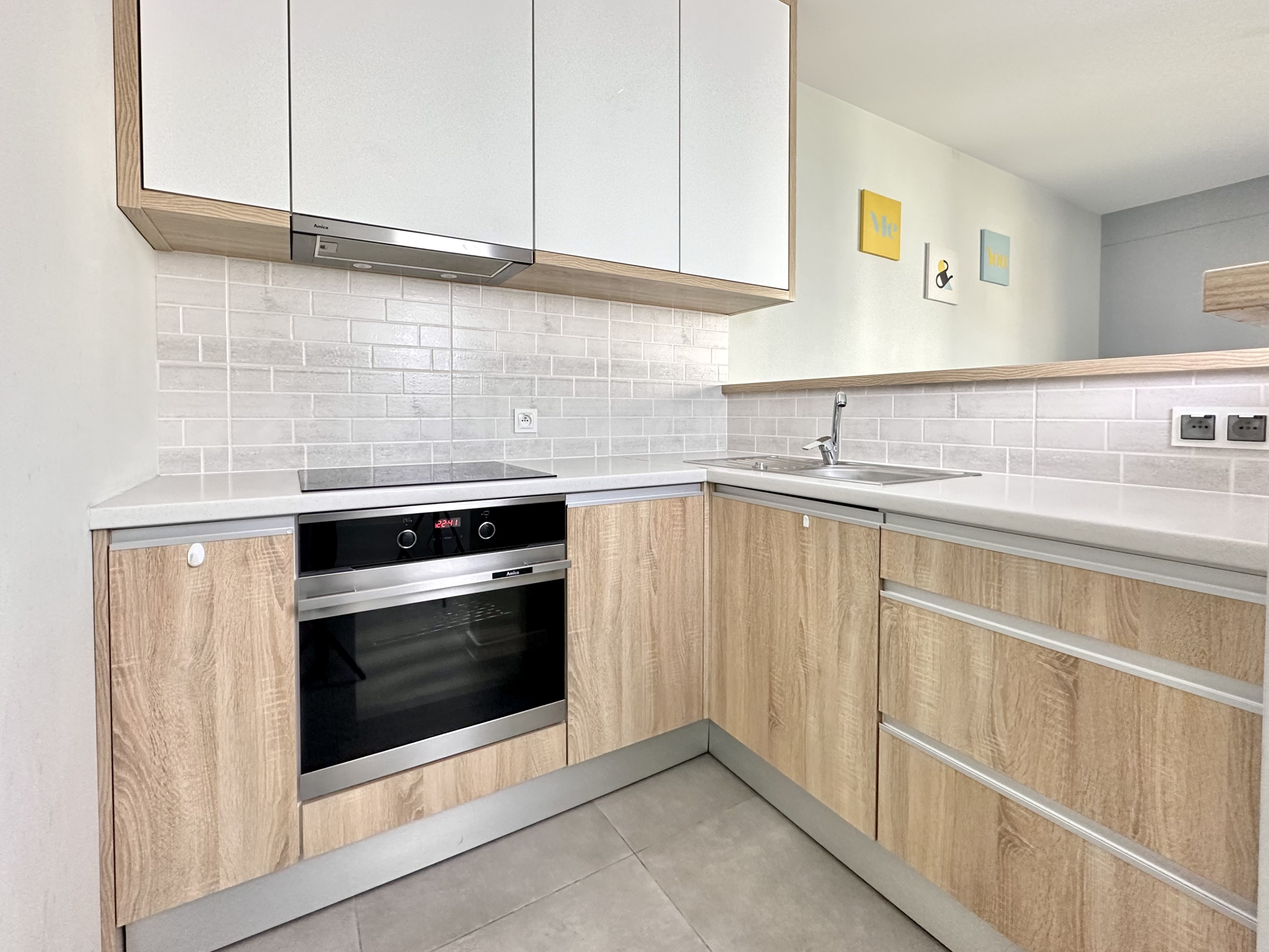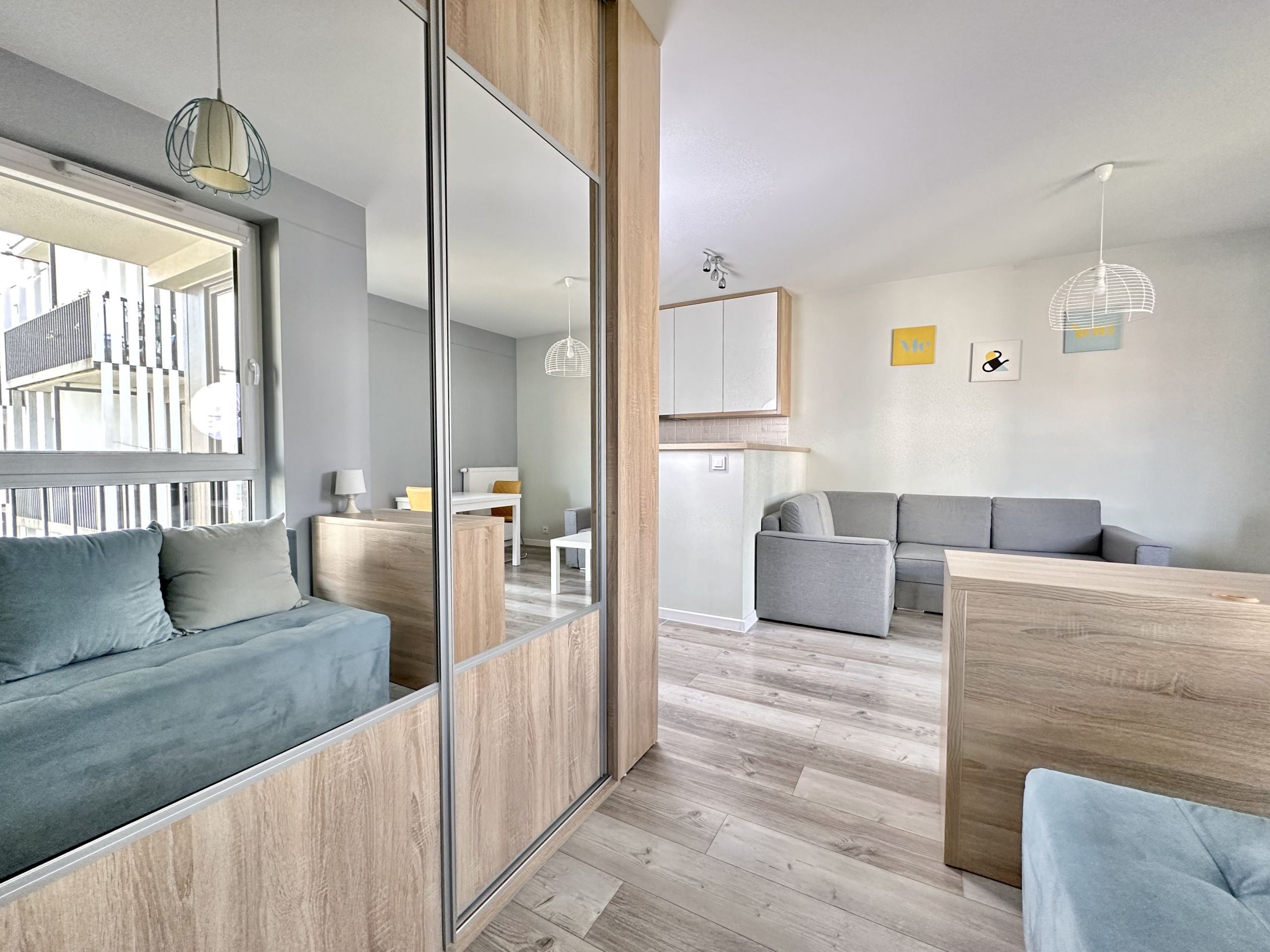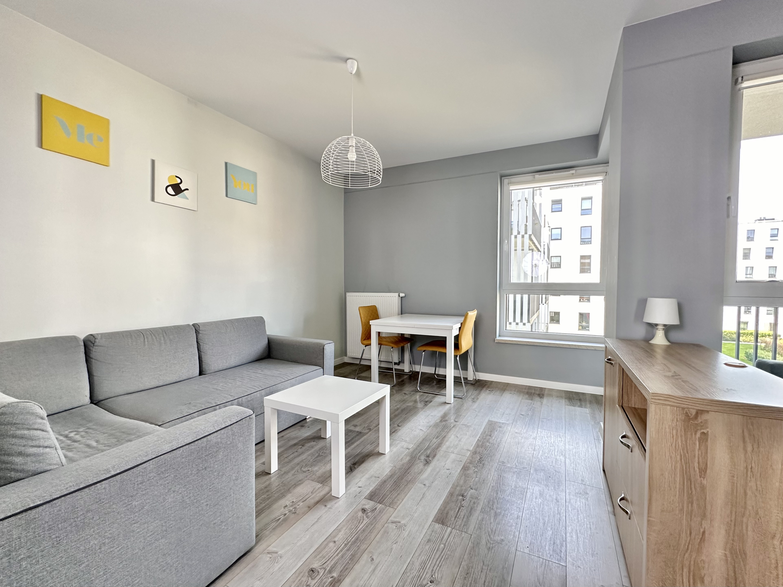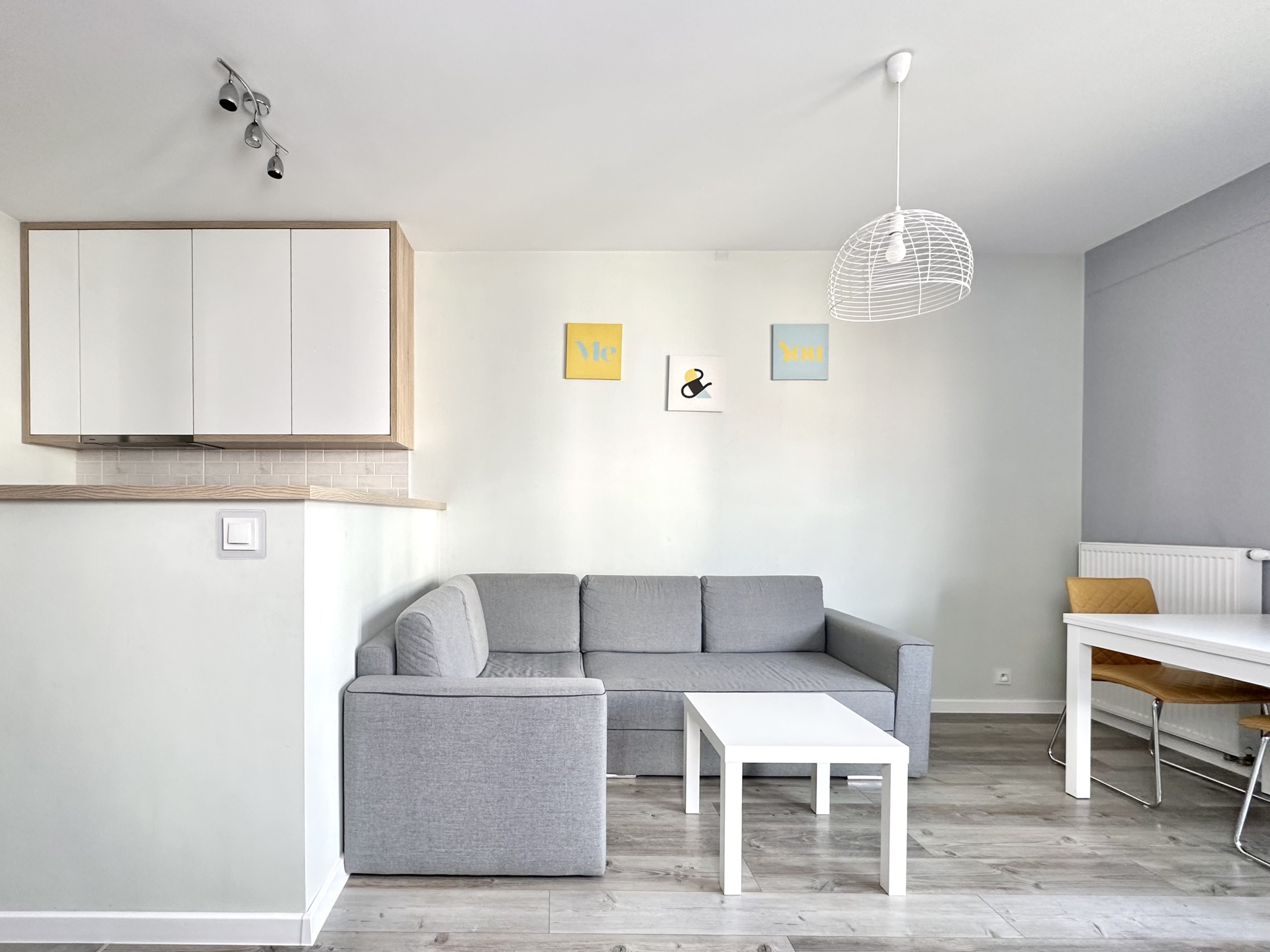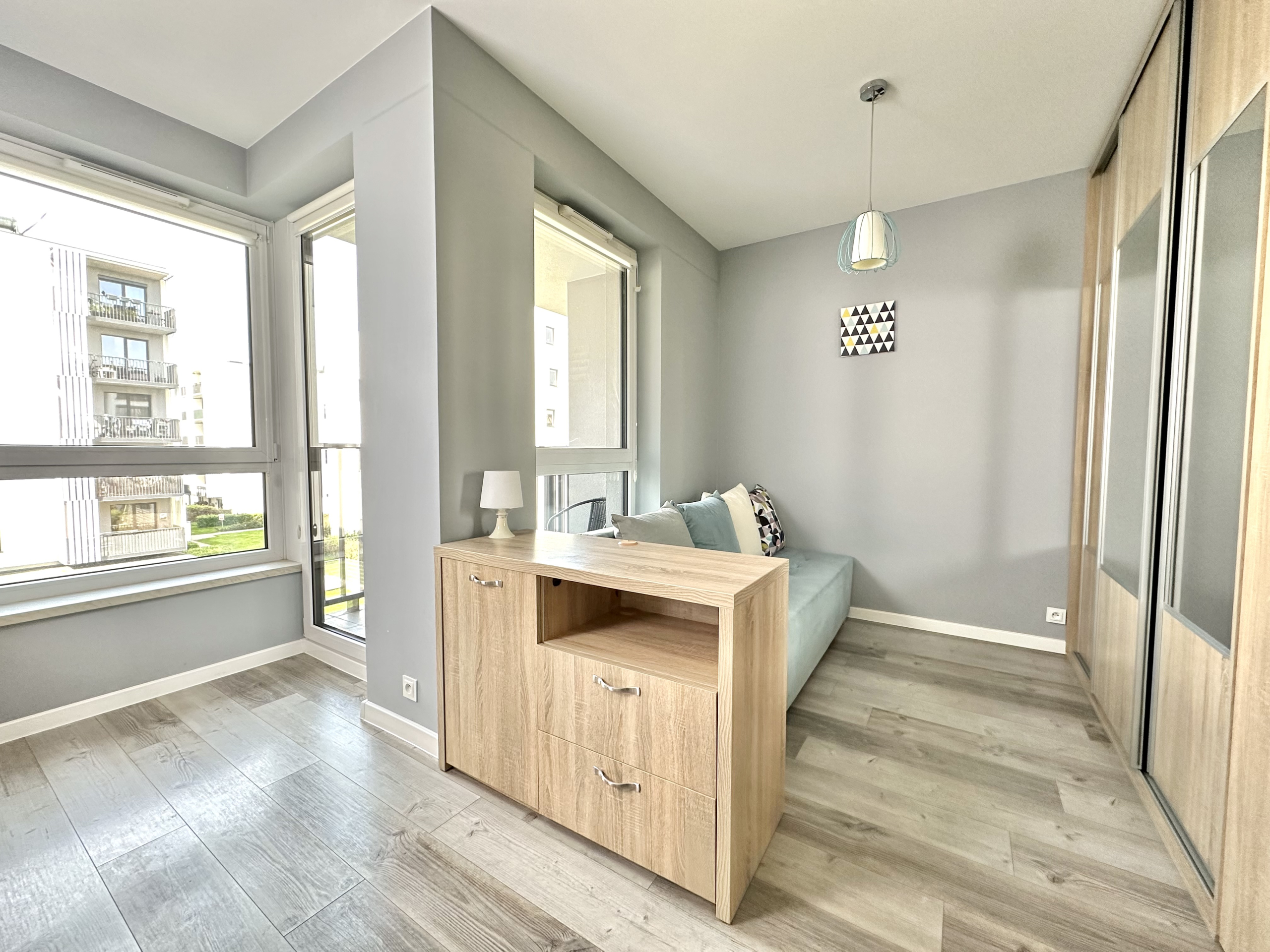 Przestrzeń została wykorzystana maksymalnie efektywnie, nie tracąc przy tym wrażenia przestronności. Część sypialniana może zostać oddzielona od części salonowej, co pozwali zachować prywatność przy przyjmowaniu gości. Układ, oraz wysokość okien zapewniają doskonałe doświetlenie całego mieszkania.
