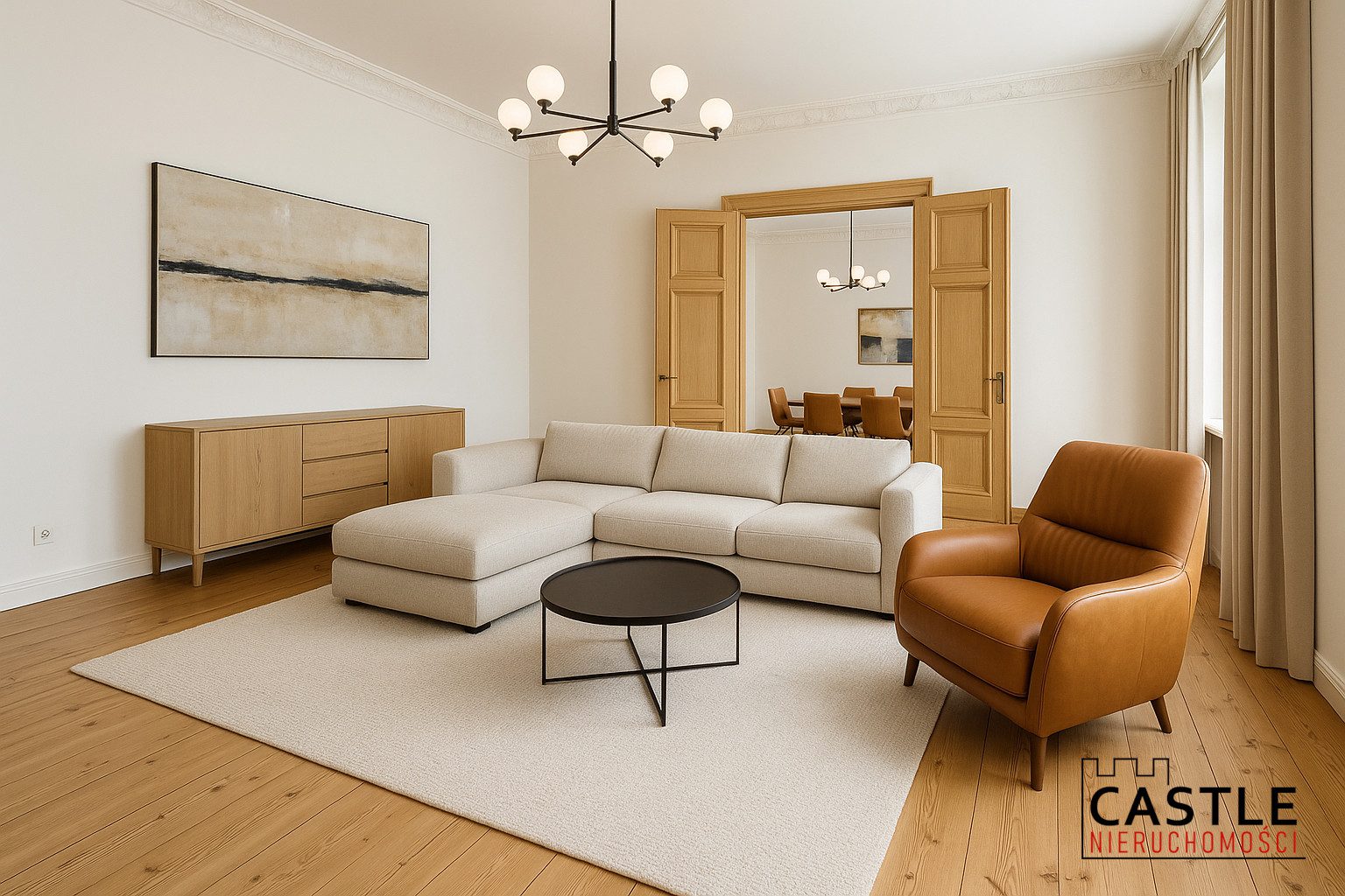 Część zdjęć prezentuje możliwe aranżacje – apartament oferuje duży potencjał do stworzenia nowoczesnej i komfortowej przestrzeni do życia.