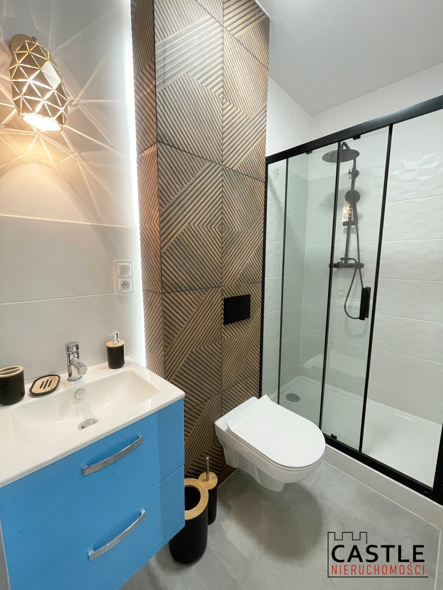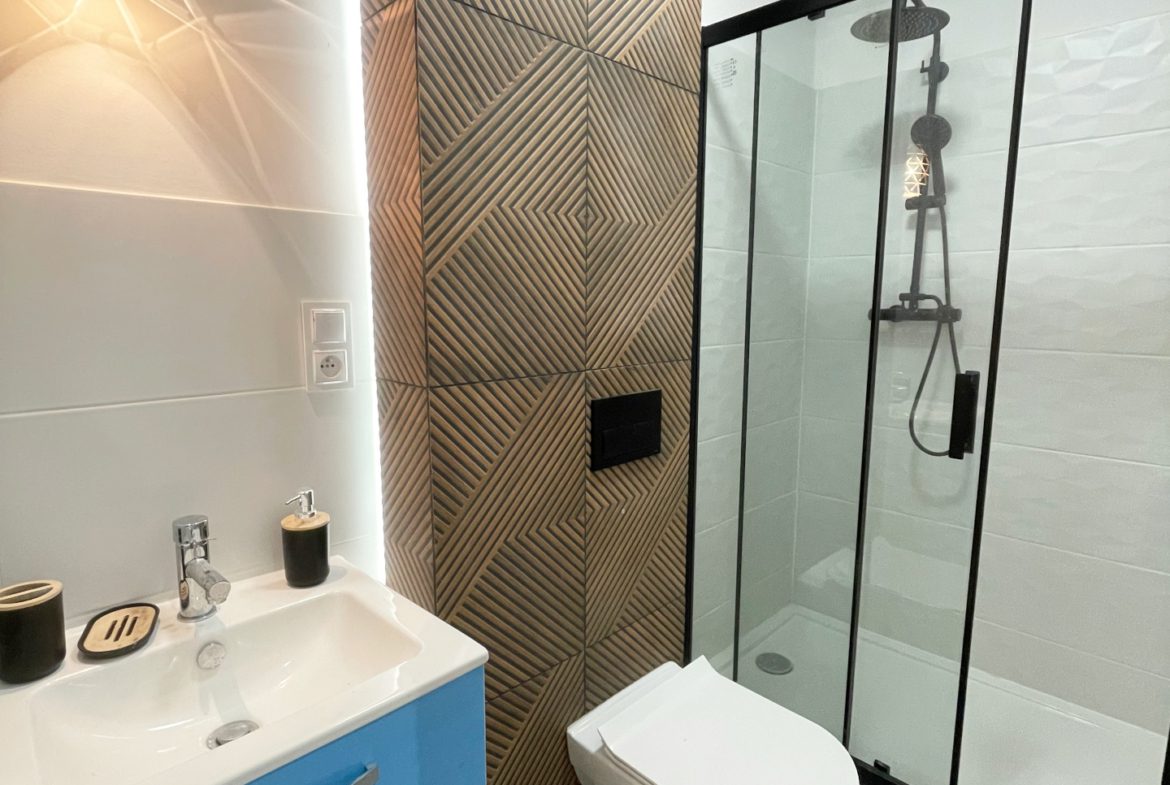 - łazienka z prysznicem, wykończona w nowoczesnym stylu