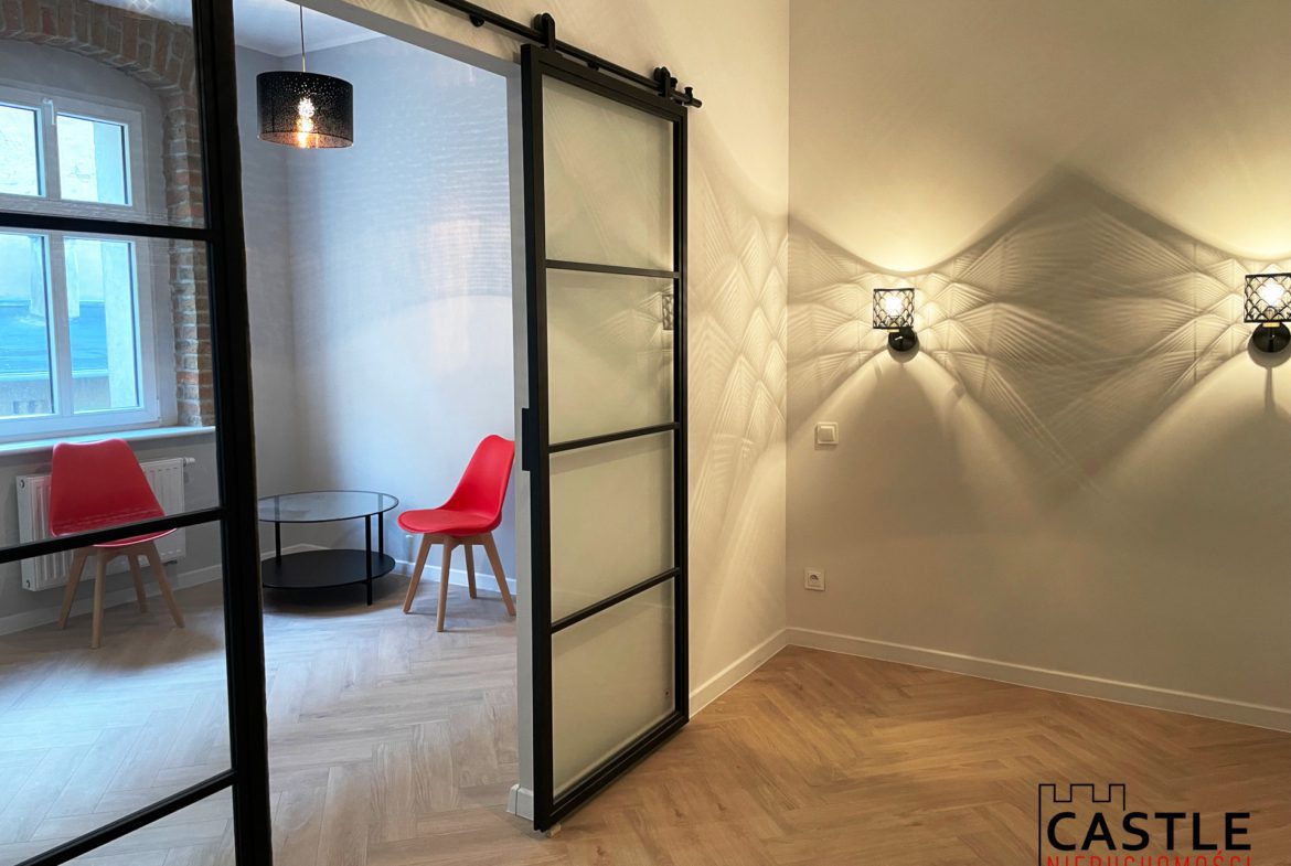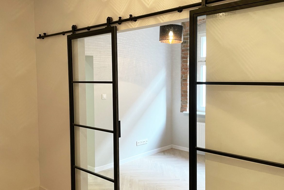 - salon z wydzieloną częścią sypialnianą oddzieloną nowoczesnymi loftowymi drzwiami – idealne dla pary, singla lub pod wynajem