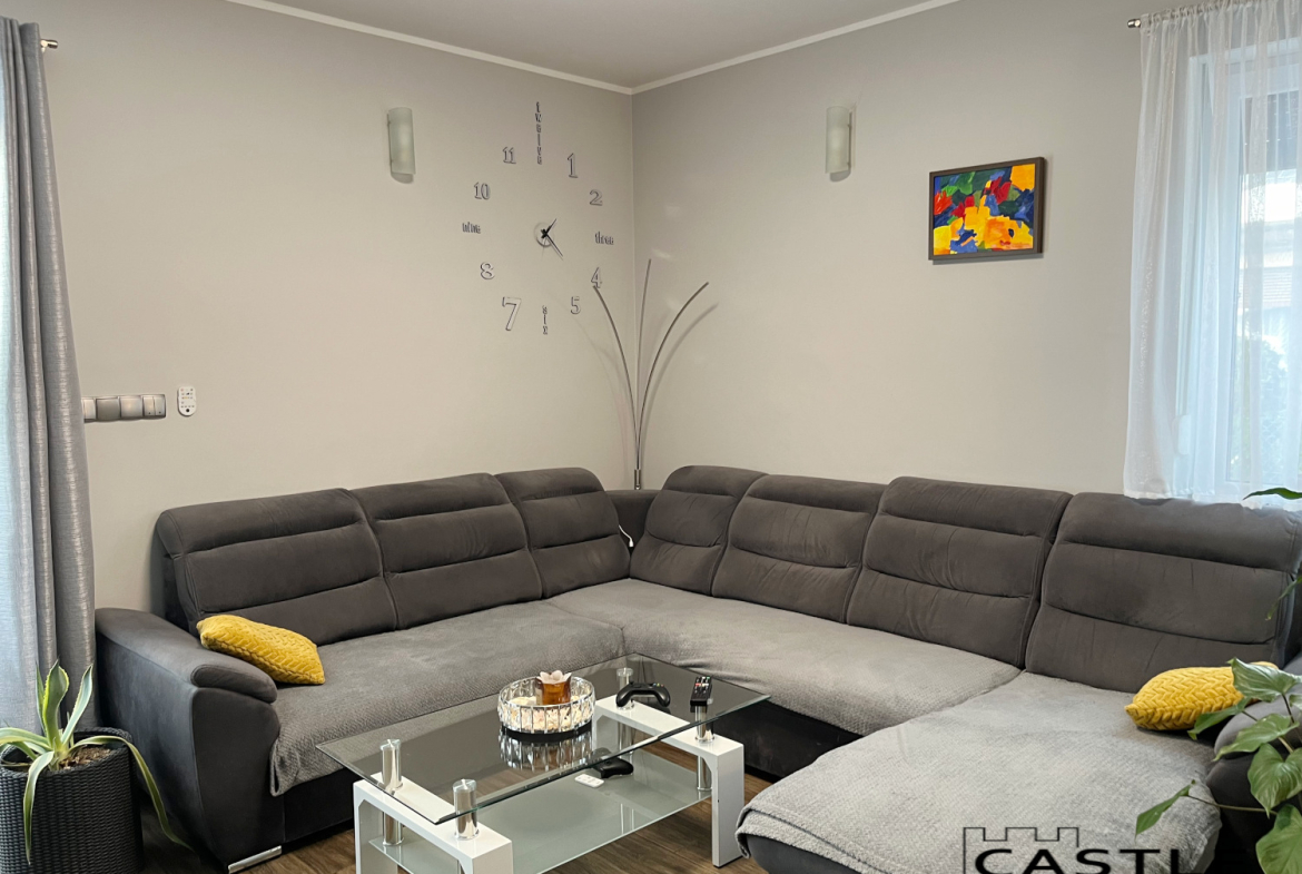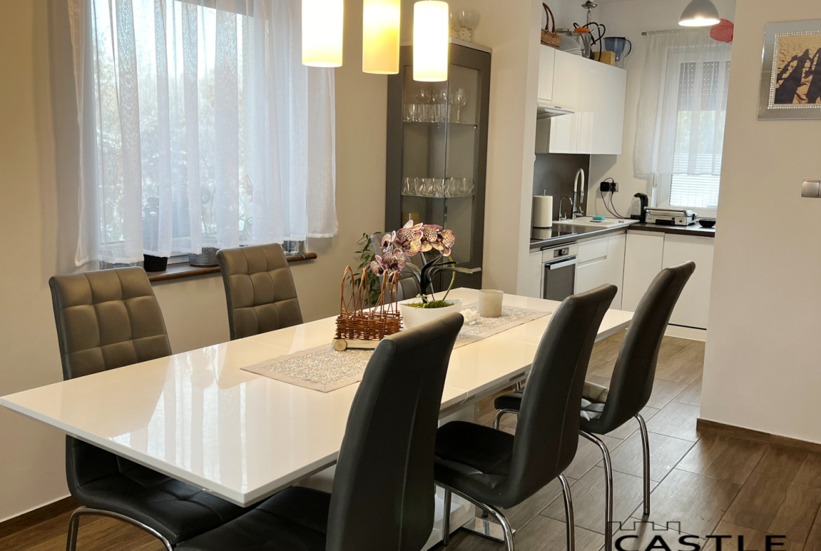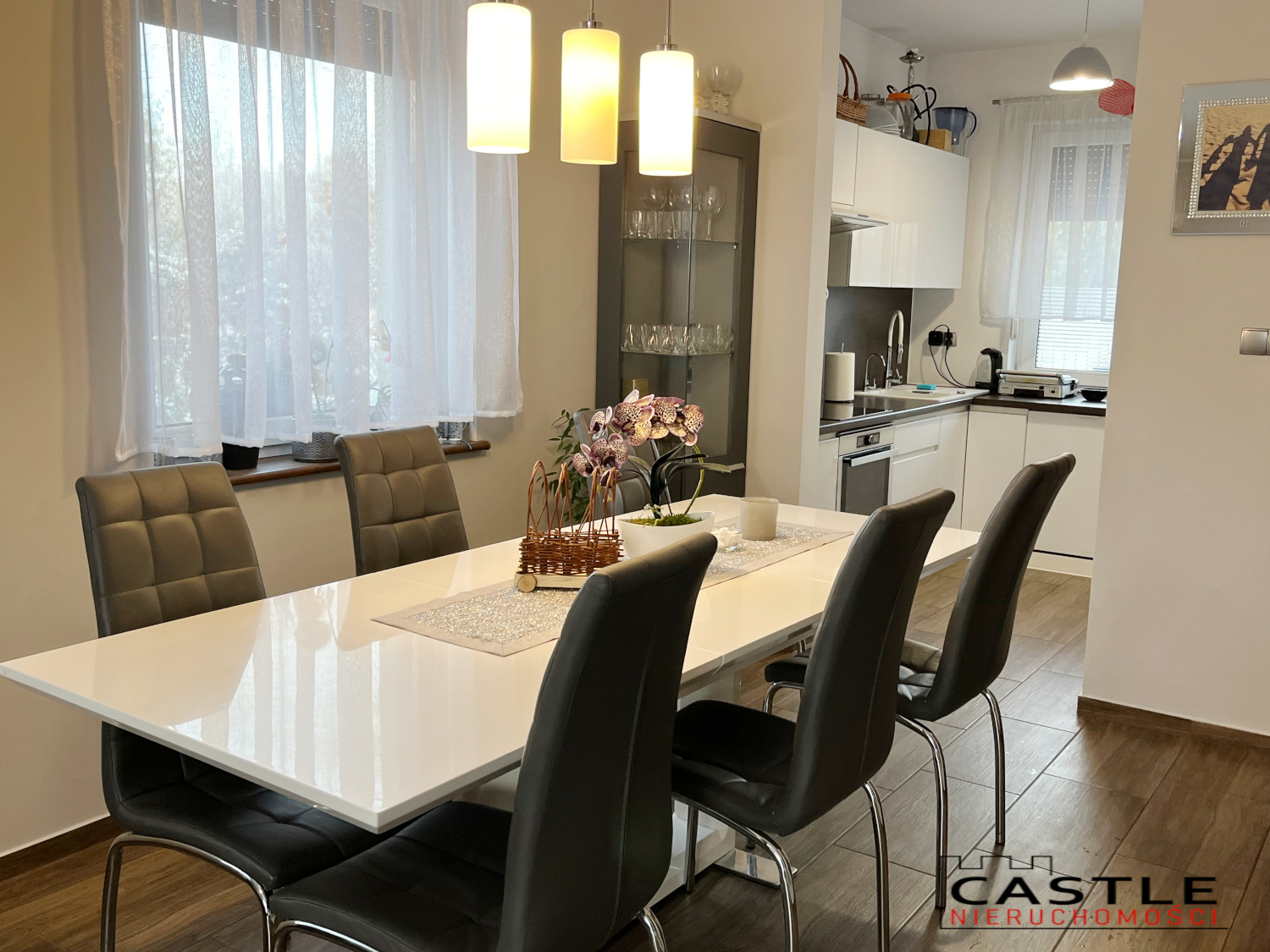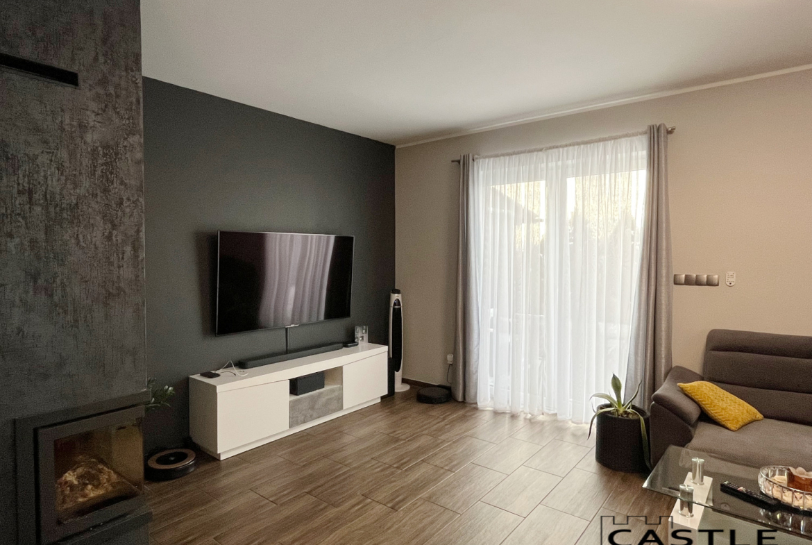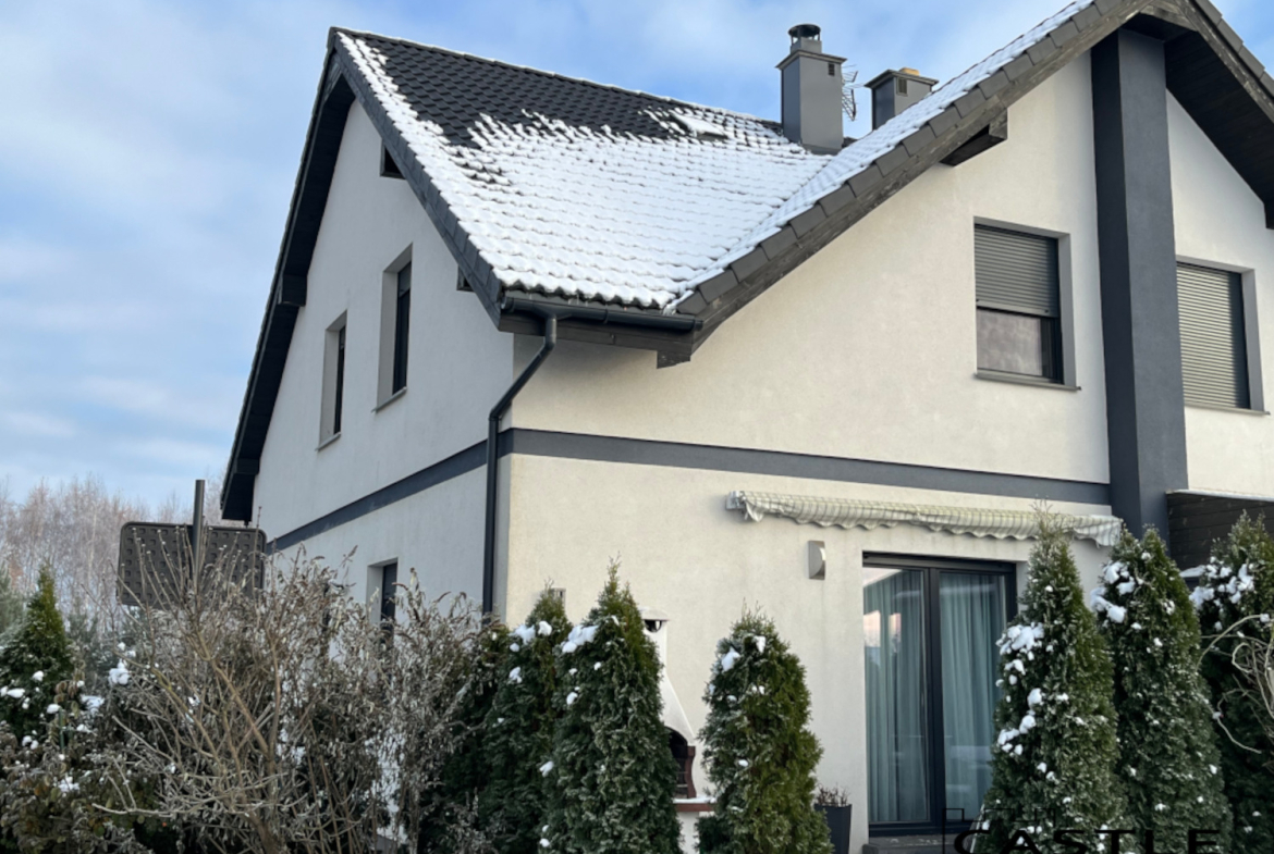 Dom w zabudowie bliźniaczej, gotowy do zamieszkania, wykończony w 2017 roku, zachwyca starannie dobranymi materiałami i działką o powierzchni 446m2.